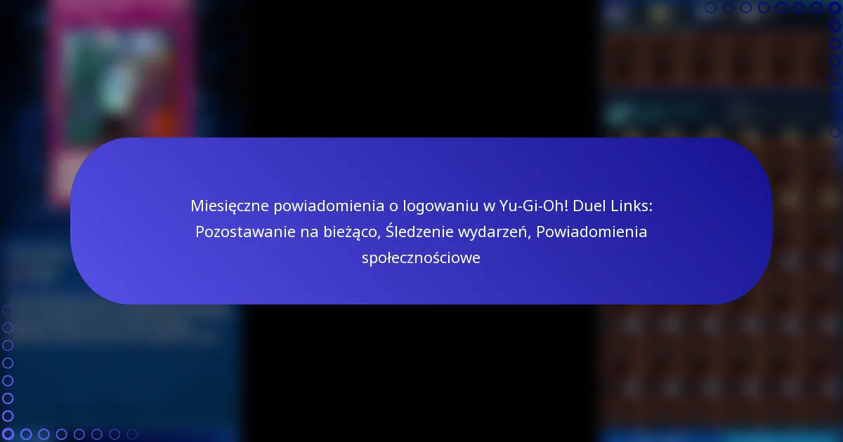 Powiadomienia o logowaniu miesięcznym w Yu-Gi-Oh! Duel Links to alerty, które informują graczy o nadchodzących wydarzeniach, aktualizacjach społeczności oraz nagrodach za logowanie się do gry. Te powiadomienia pomagają graczom pozostać zaangażowanymi i poinformowanymi o rozwoju gry oraz specjalnych promocjach.